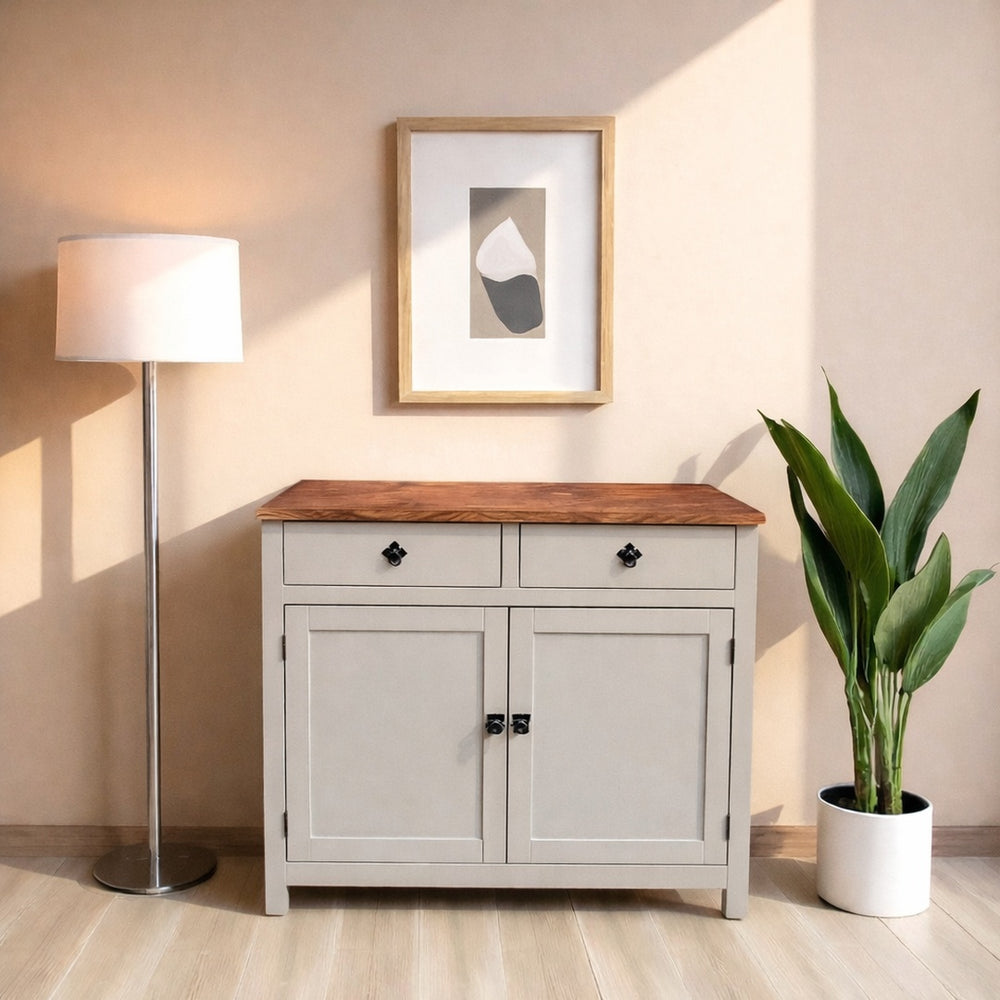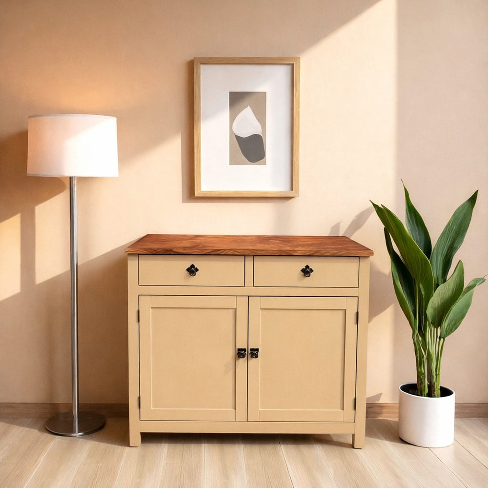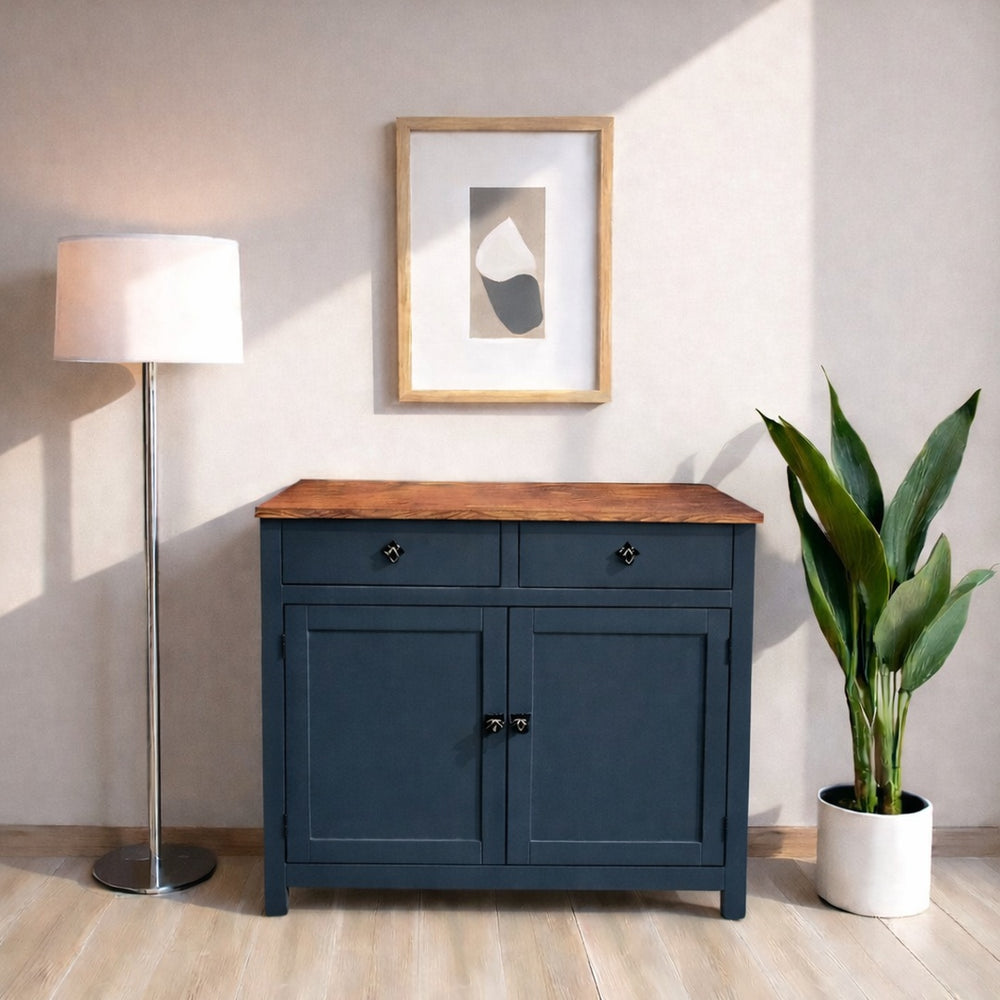 Fabricado artesanalmente en Chile, este buffet de madera de pino es mucho más que un mueble de almacenamiento; es la base perfecta para tu cafetera y accesorios. La estructura cuenta con un acabado de pintura al agua con sellador (ecológico y suave), mientras que la cubierta superior recibe un tratamiento de sellador con laca de alta resistencia, ideal para soportar el uso diario, tazas y pequeños electrodomésticos.