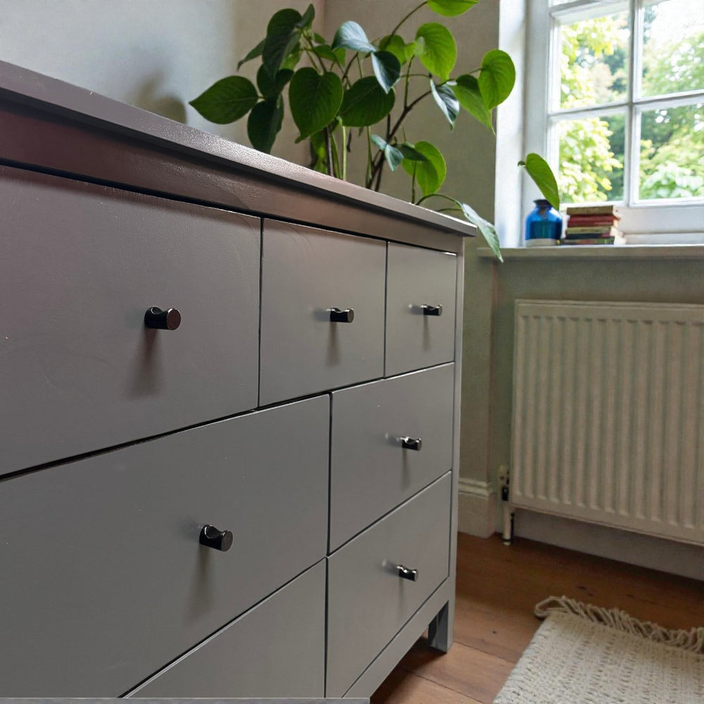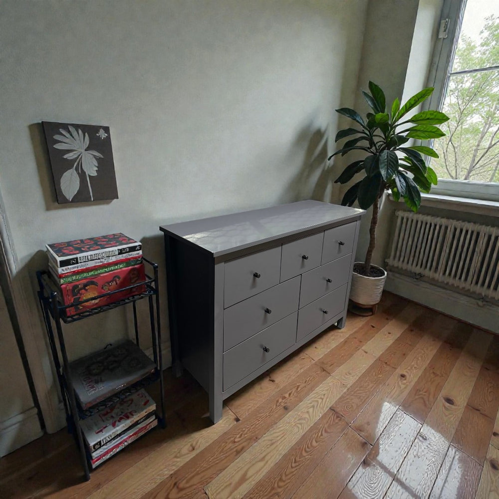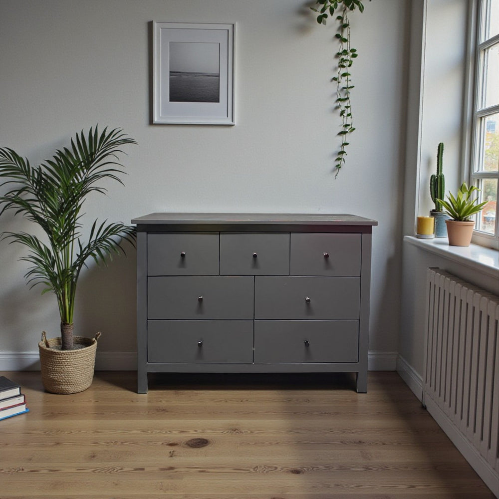 Cuenta con 7 cajones en total: tres superiores más pequeños y cuatro inferiores más amplios. Ideal para guardar ropa, textiles, documentos o accesorios con orden y estética.