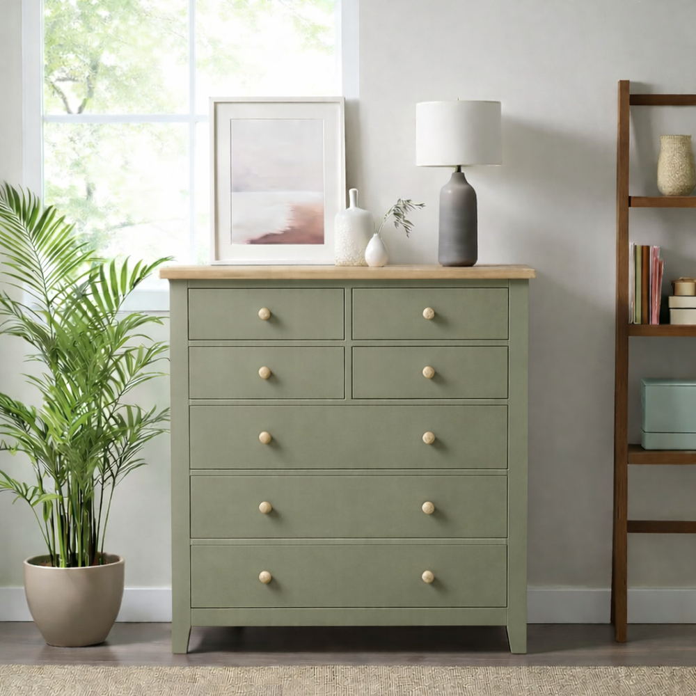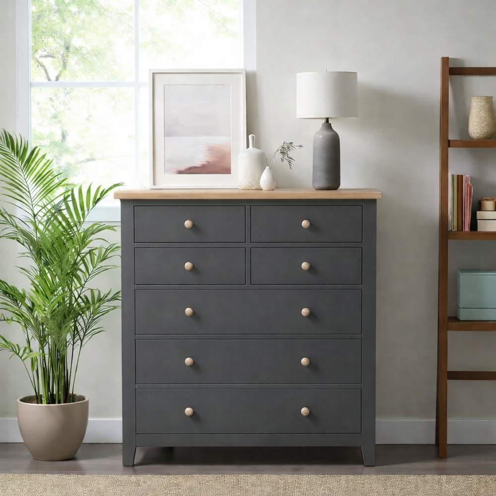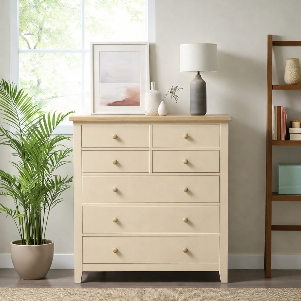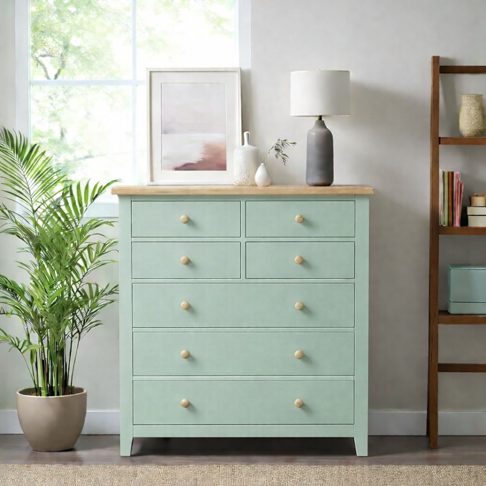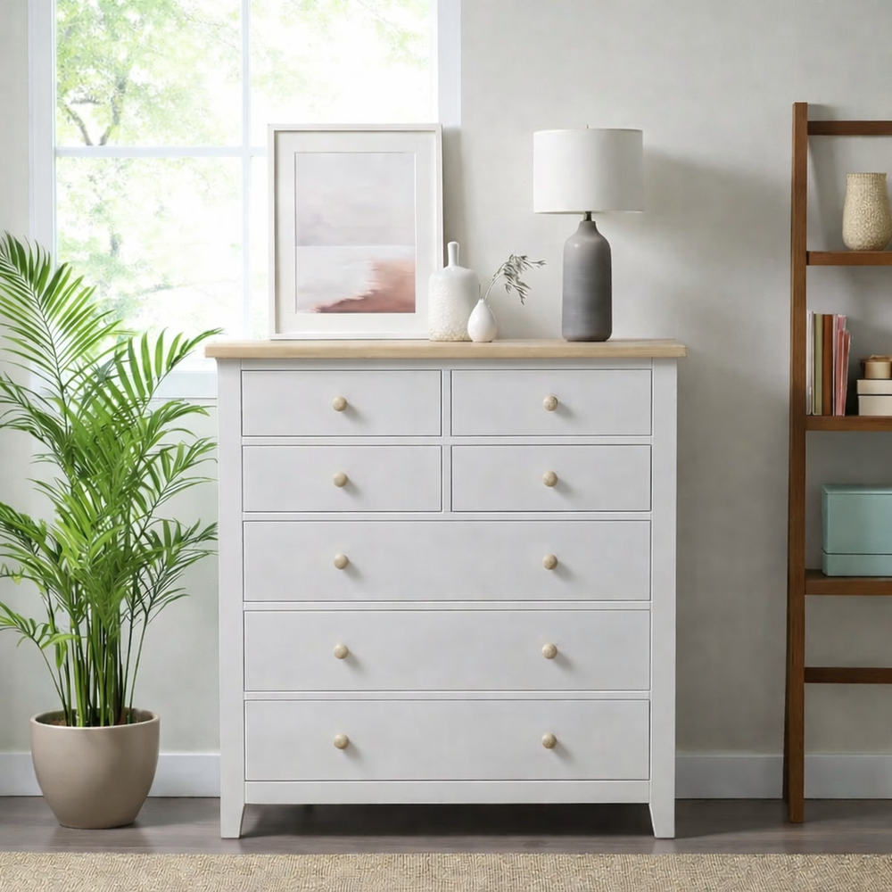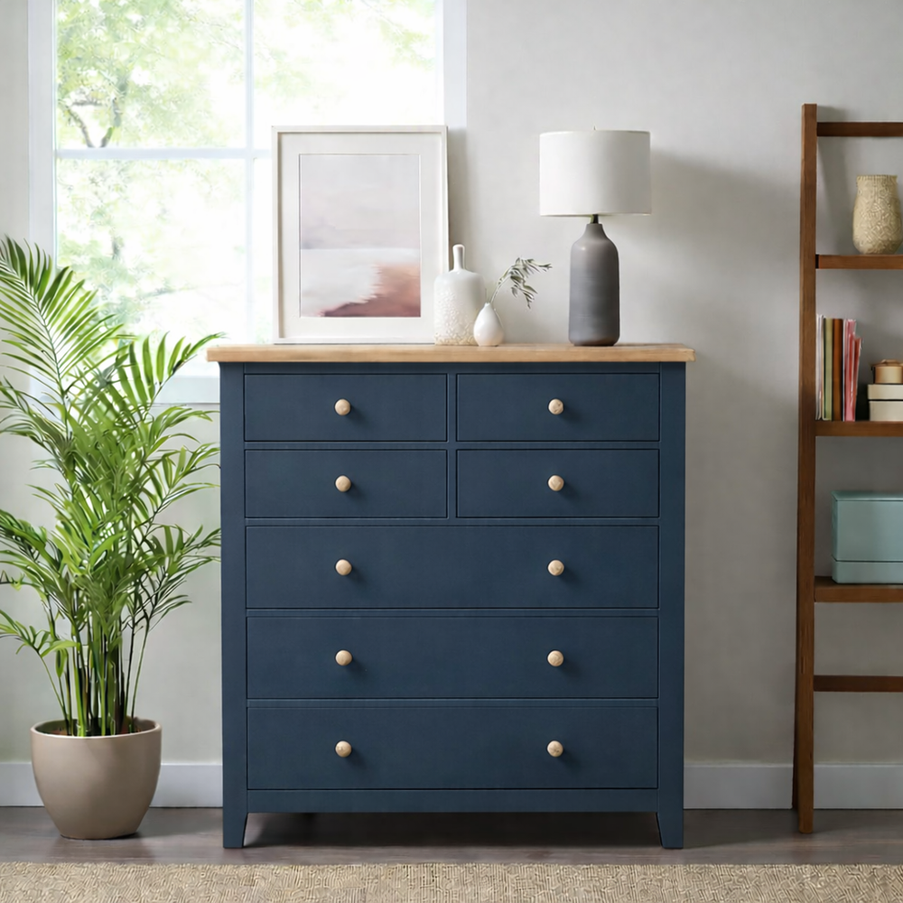 Fabricada artesanalmente en Chile, esta cómoda de madera de pino destaca por su imponente altura de 115 cm, ideal para aprovechar el espacio vertical. La estructura recibe un acabado de pintura al agua con sellador (ecológica y sedosa), mientras que la cubierta superior es protegida con sellador y laca de alta resistencia, resaltando la veta natural y asegurando durabilidad por generaciones.