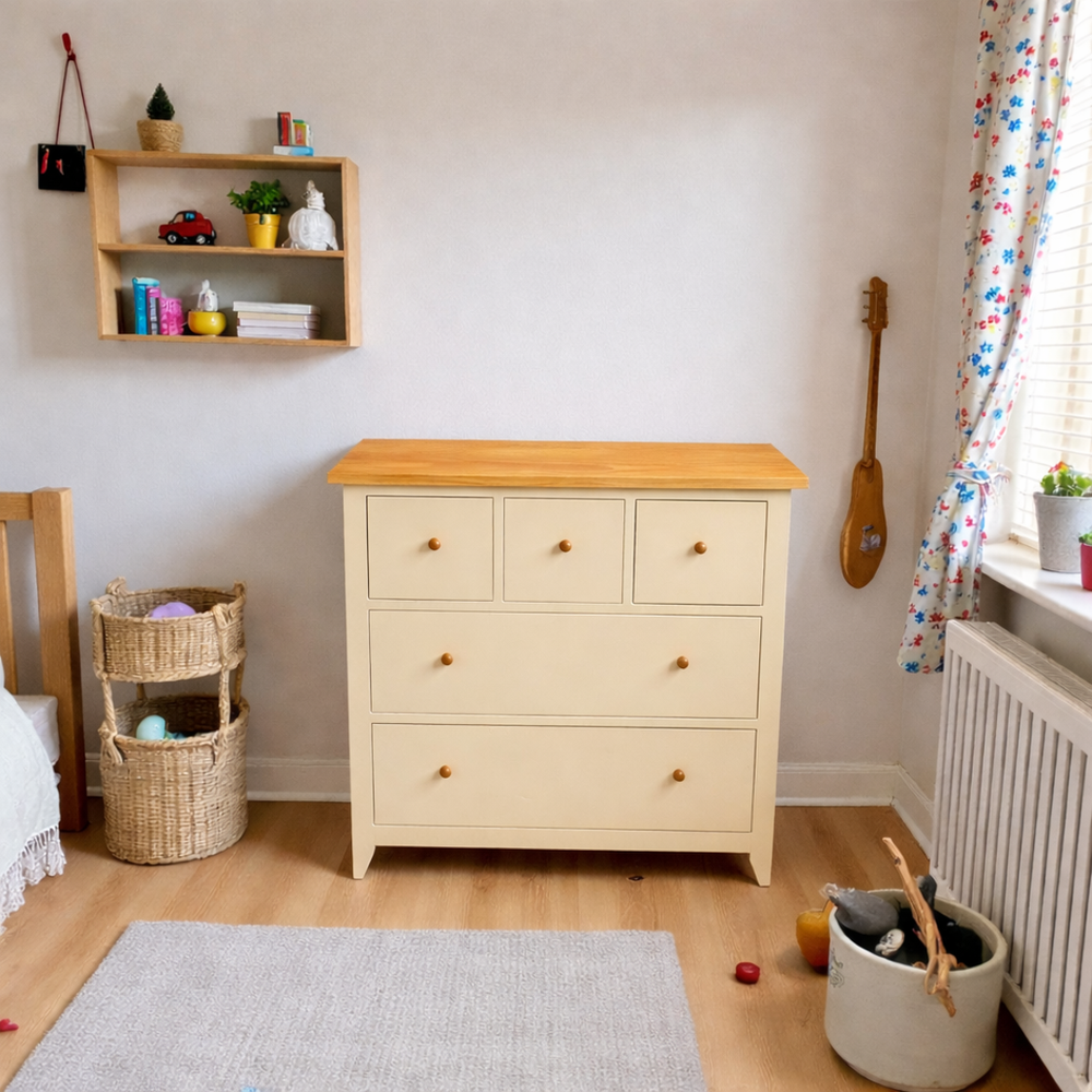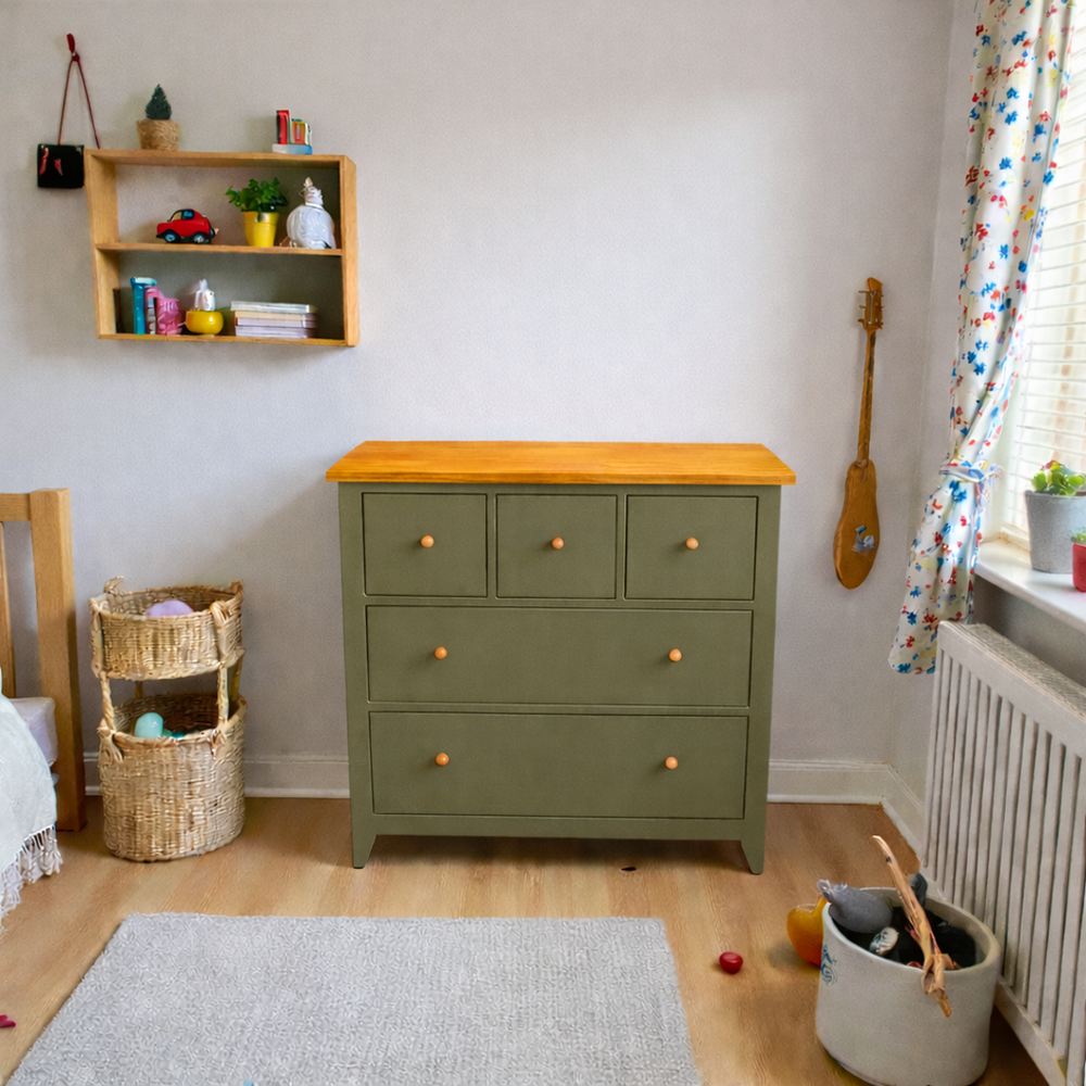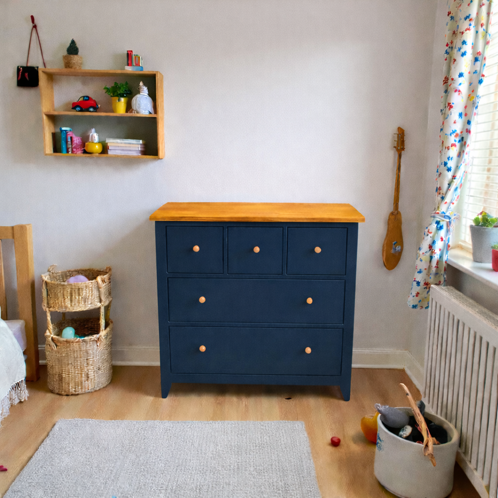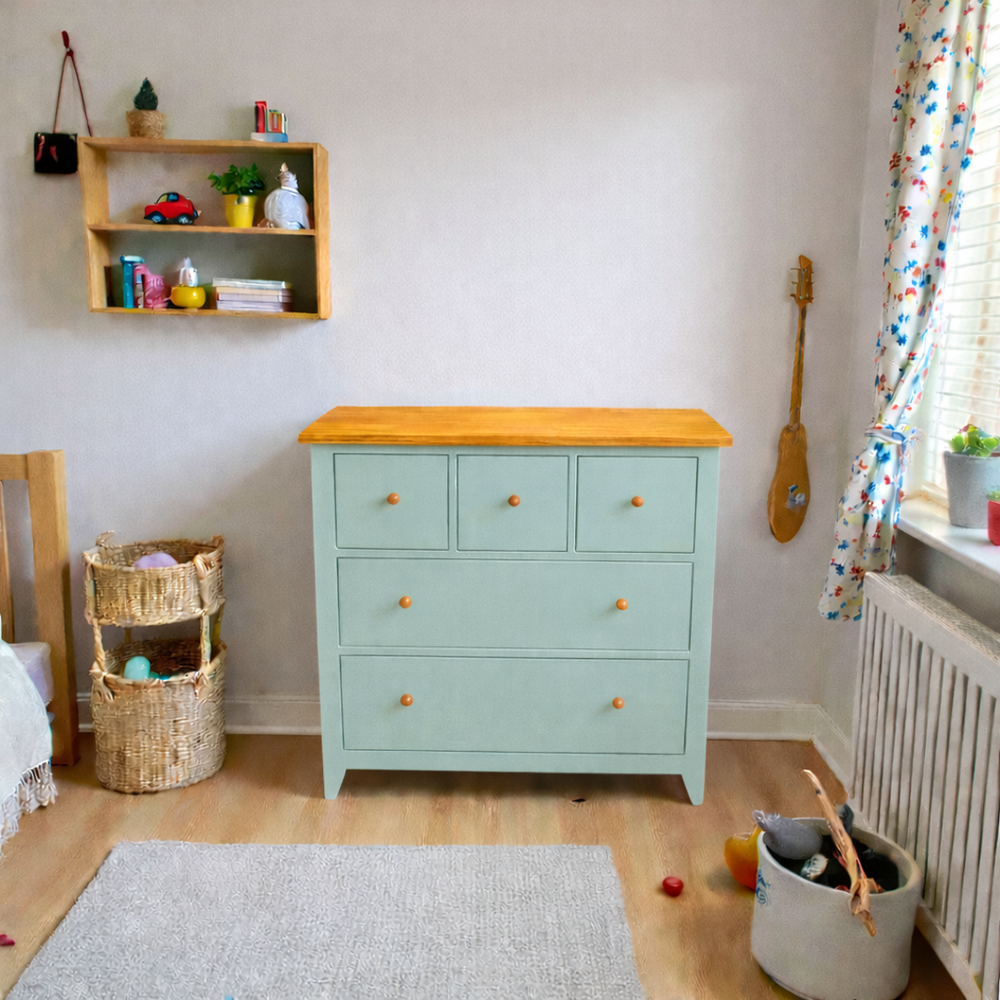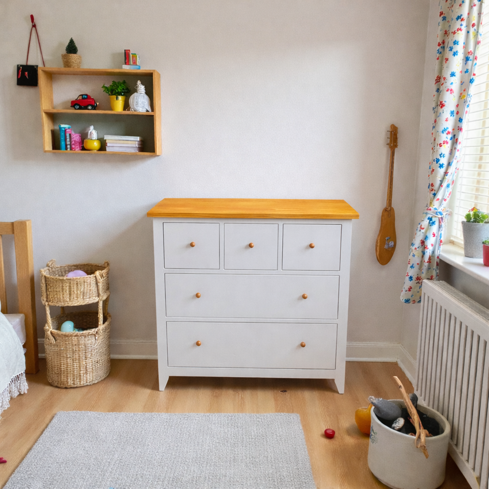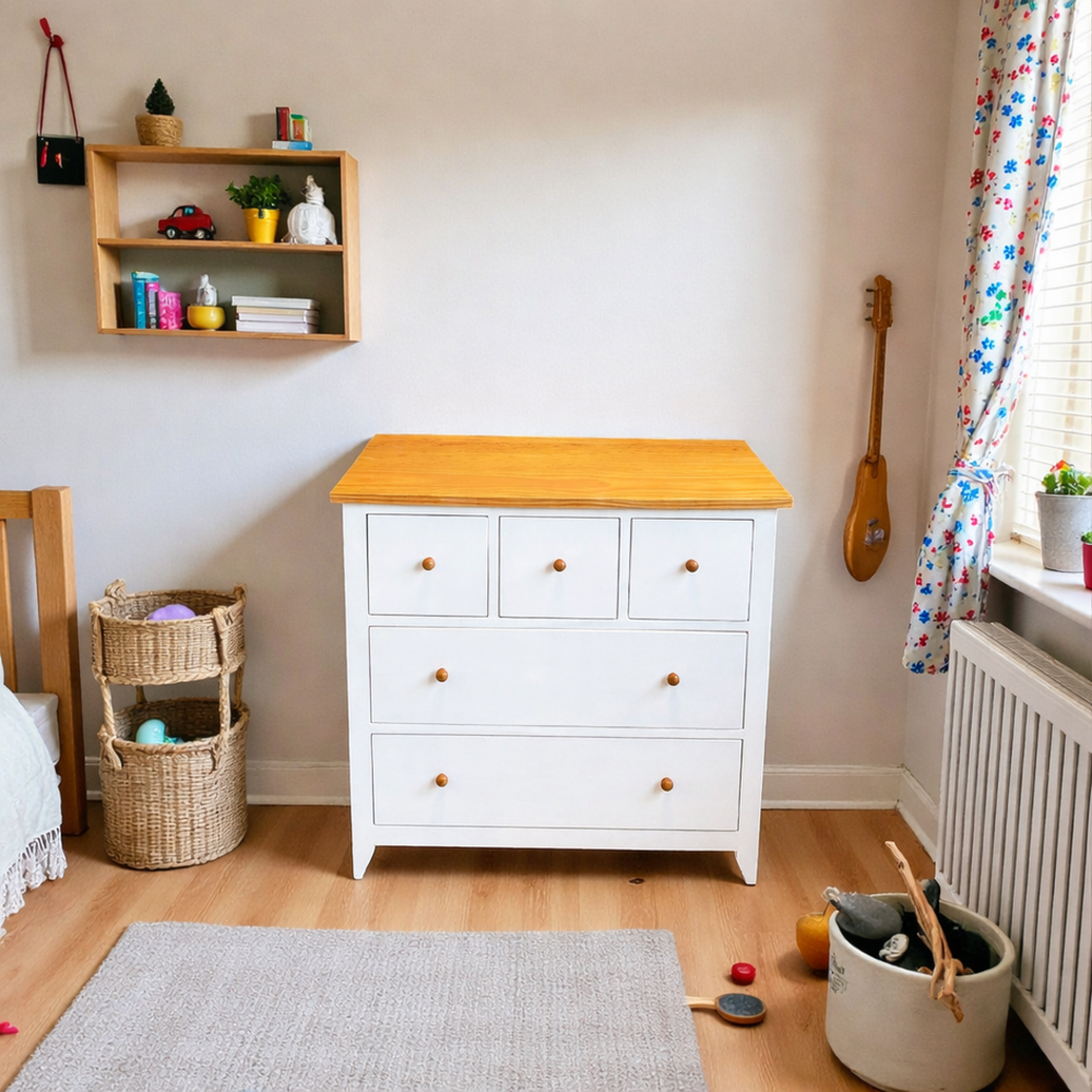 Fabricada artesanalmente en Chile, esta cómoda infantil de madera de pino destaca por su robustez y seguridad. Pensando en el bienestar de tu familia, utilizamos pintura al agua con sellador (libre de químicos fuertes y olores intensos) y una cubierta protegida con sellador y laca de alta resistencia. Con una profundidad de 50 cm, ofrece una estabilidad superior y un espacio de guardado excepcional para ropa, juguetes y textiles.