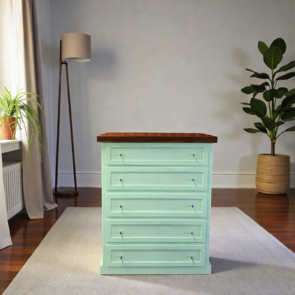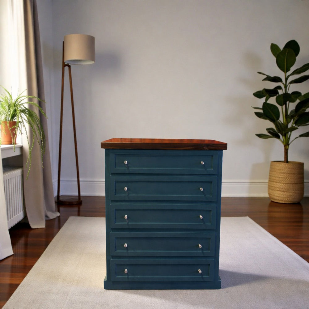Fabricada artesanalmente en Chile, esta cómoda de madera de pino destaca por su robustez y atención al detalle. Siguiendo nuestros estándares de calidad, la estructura cuenta con un acabado de pintura al agua con sellador (ecológica y suave al tacto), mientras que la superficie superior es protegida con sellador y laca de alta resistencia. Este proceso garantiza un mueble duradero, resistente al uso diario y fácil de mantener.