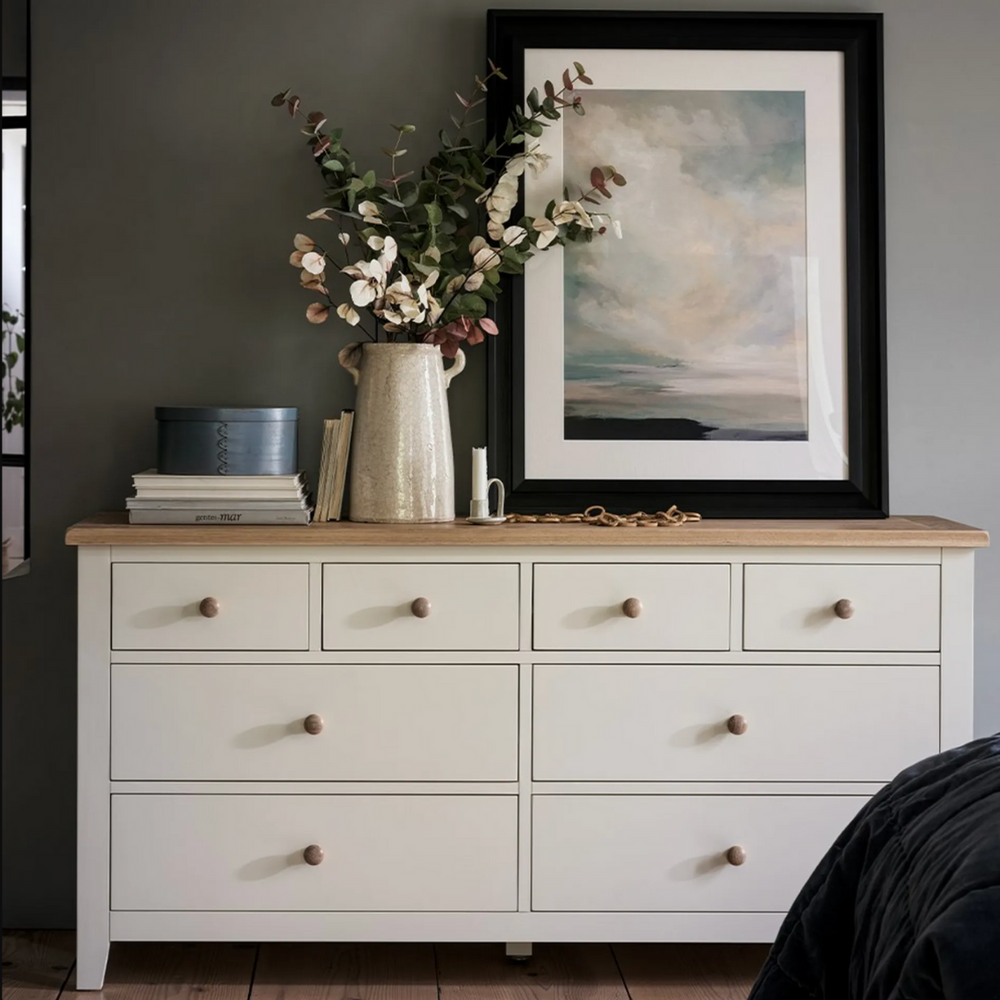 En Arca Muebles, diseñamos muebles funcionales y duraderos. Esta cómoda de madera de pino es el equilibrio perfecto entre gran capacidad de almacenamiento y un estilo atemporal, ideal para dormitorios y espacios familiares. Con 8 cajones equipados con correderas telescópicas, tendrás el orden real que necesitas para tu ropa y accesorios, con un uso suave y silencioso.