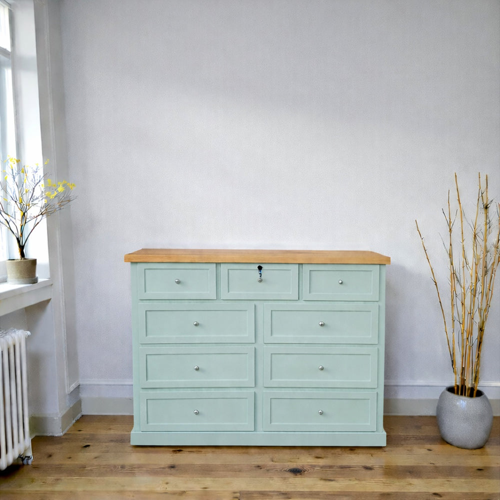Fabricada artesanalmente en Chile, esta cómoda de madera de pino destaca por su acabado cepillado que resalta la belleza de la veta. La estructura está terminada con pintura al agua con sellador (ecológica y sedosa), mientras que la cubierta superior cuenta con sellador y laca de alta resistencia, garantizando un mueble duradero que soporta el uso diario con elegancia.