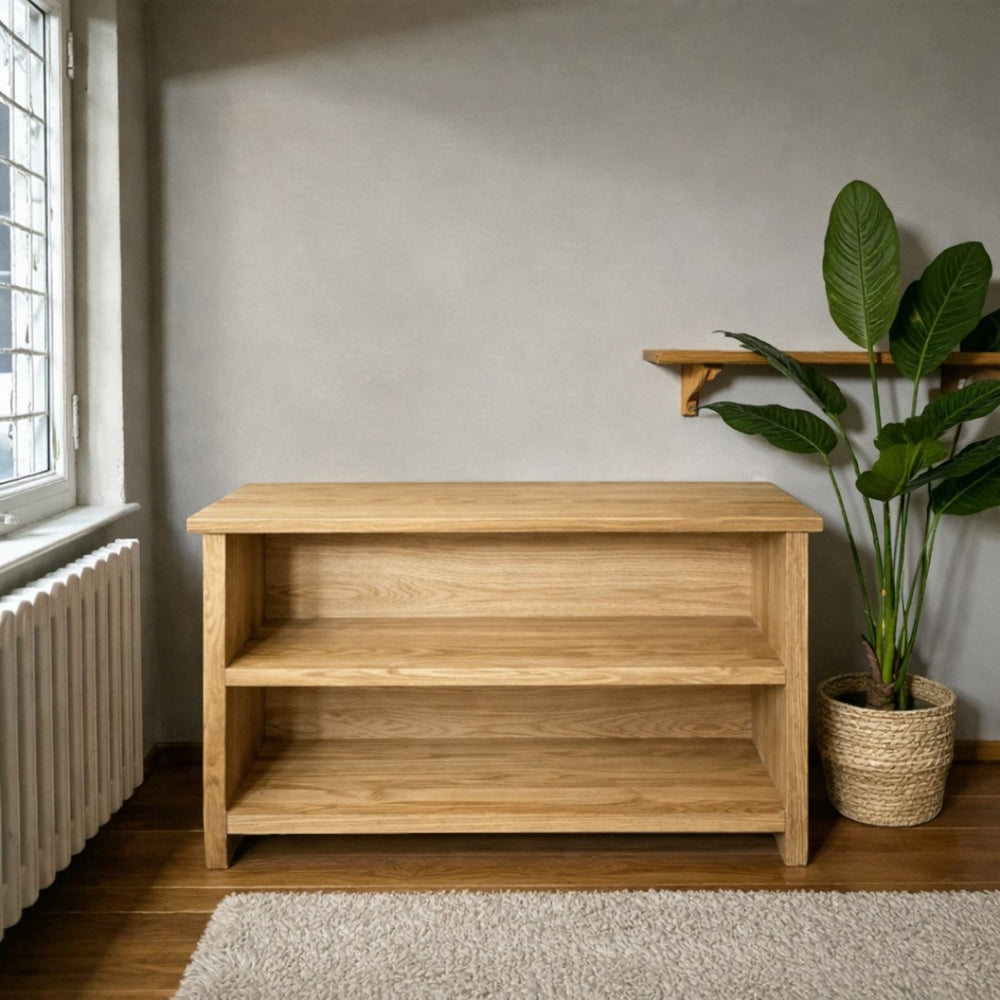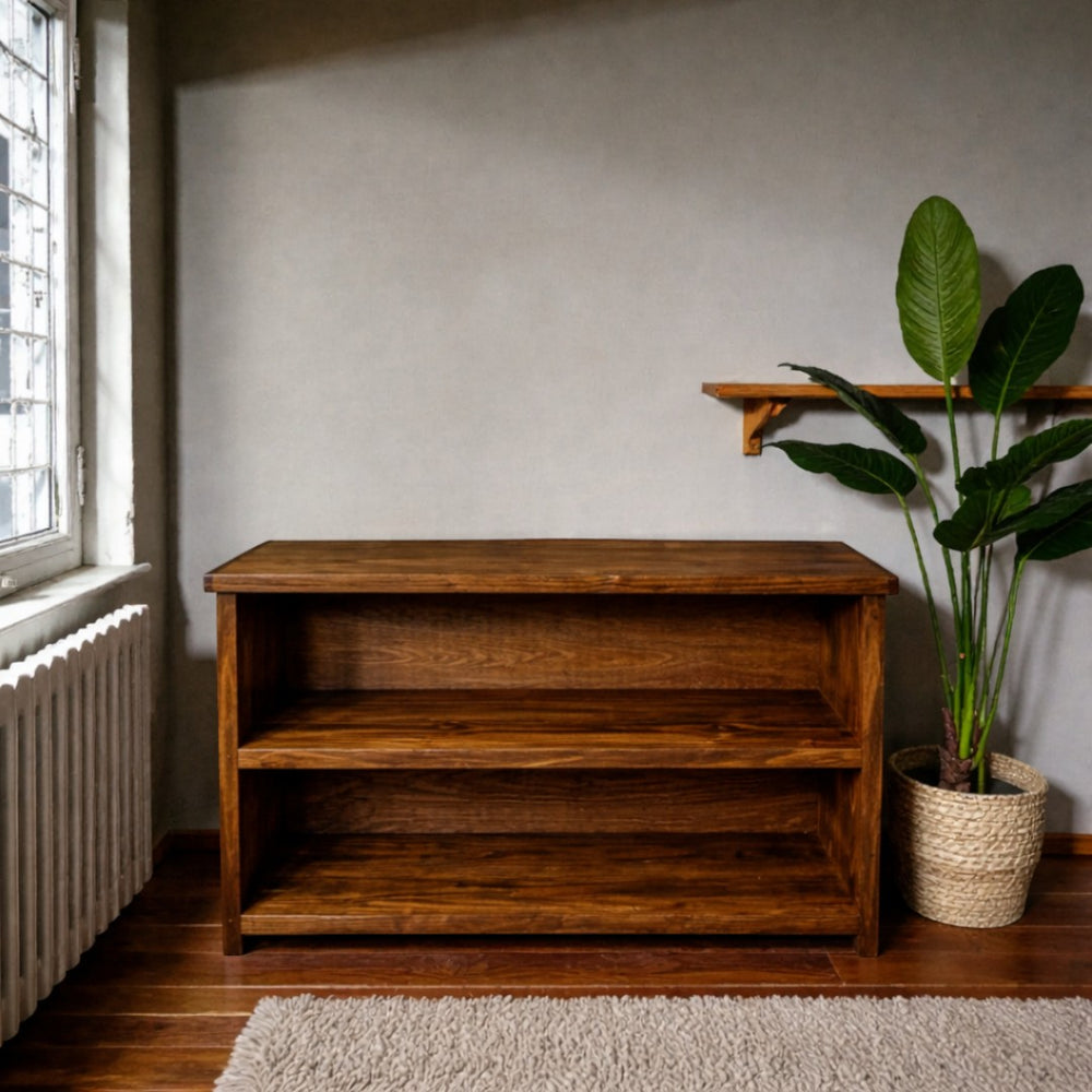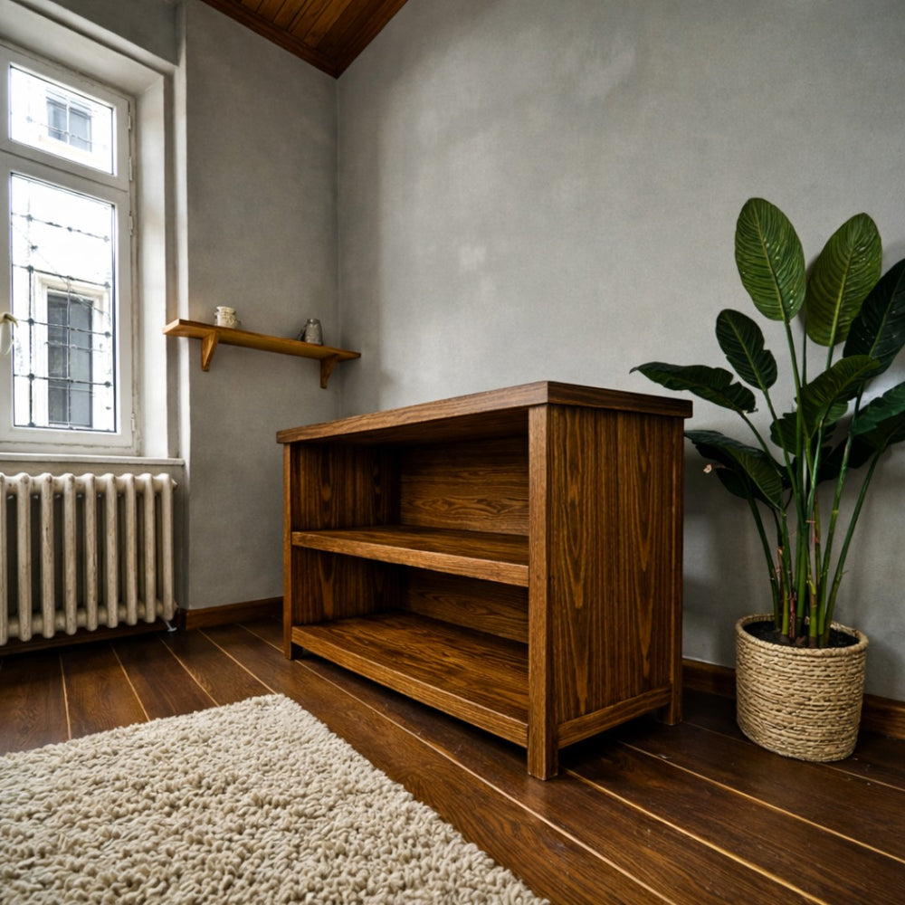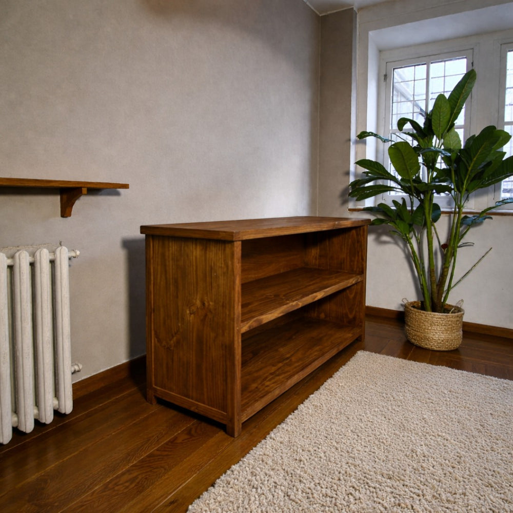 Fabricado artesanalmente en Chile, este rack destaca por su acabado cepillado que realza la veta profunda y los nudos naturales del pino. Es la pieza ideal para quienes valoran el diseño honesto y los materiales nobles que envejecen con elegancia, aportando un carácter rústico y robusto a cualquier zona de entretenimiento.