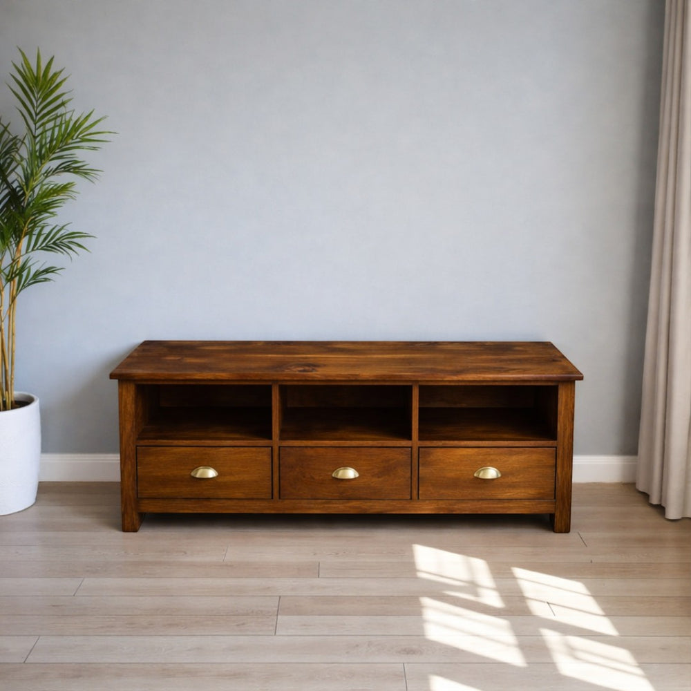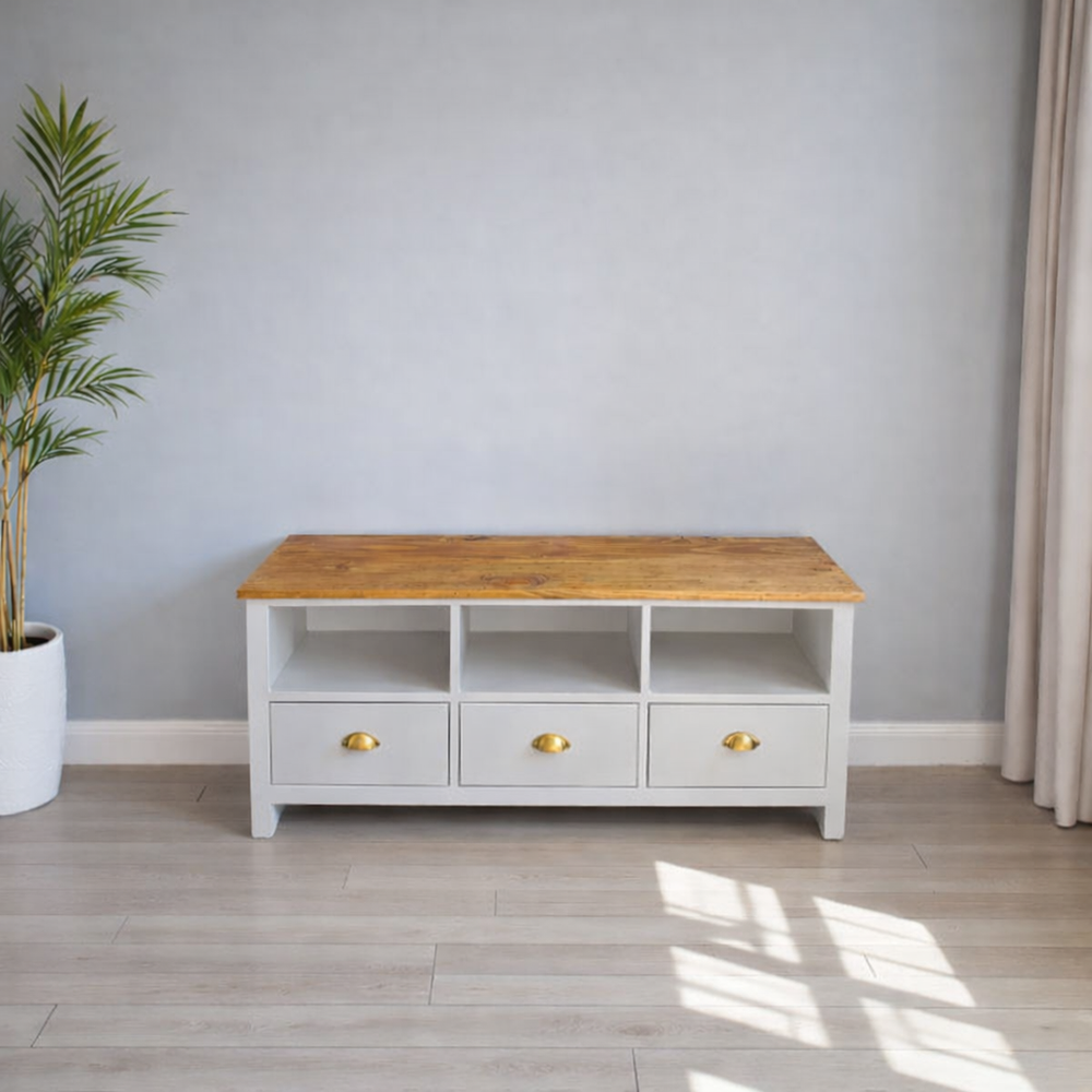 Fabricado artesanalmente en Chile, este mueble de TV de madera de pino destaca por su robustez estructural y terminaciones de alta gama. Para asegurar un acabado excepcional, la estructura recibe un tratamiento de pintura al agua con sellador (ecológica y sedosa), mientras que la superficie superior es protegida con sellador y laca de alta resistencia, garantizando durabilidad frente al roce de dispositivos y el paso del tiempo.
