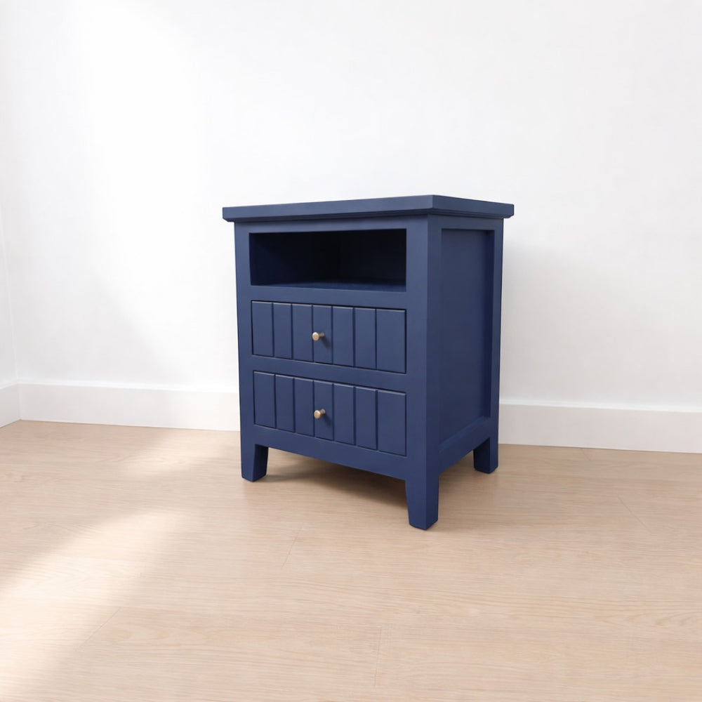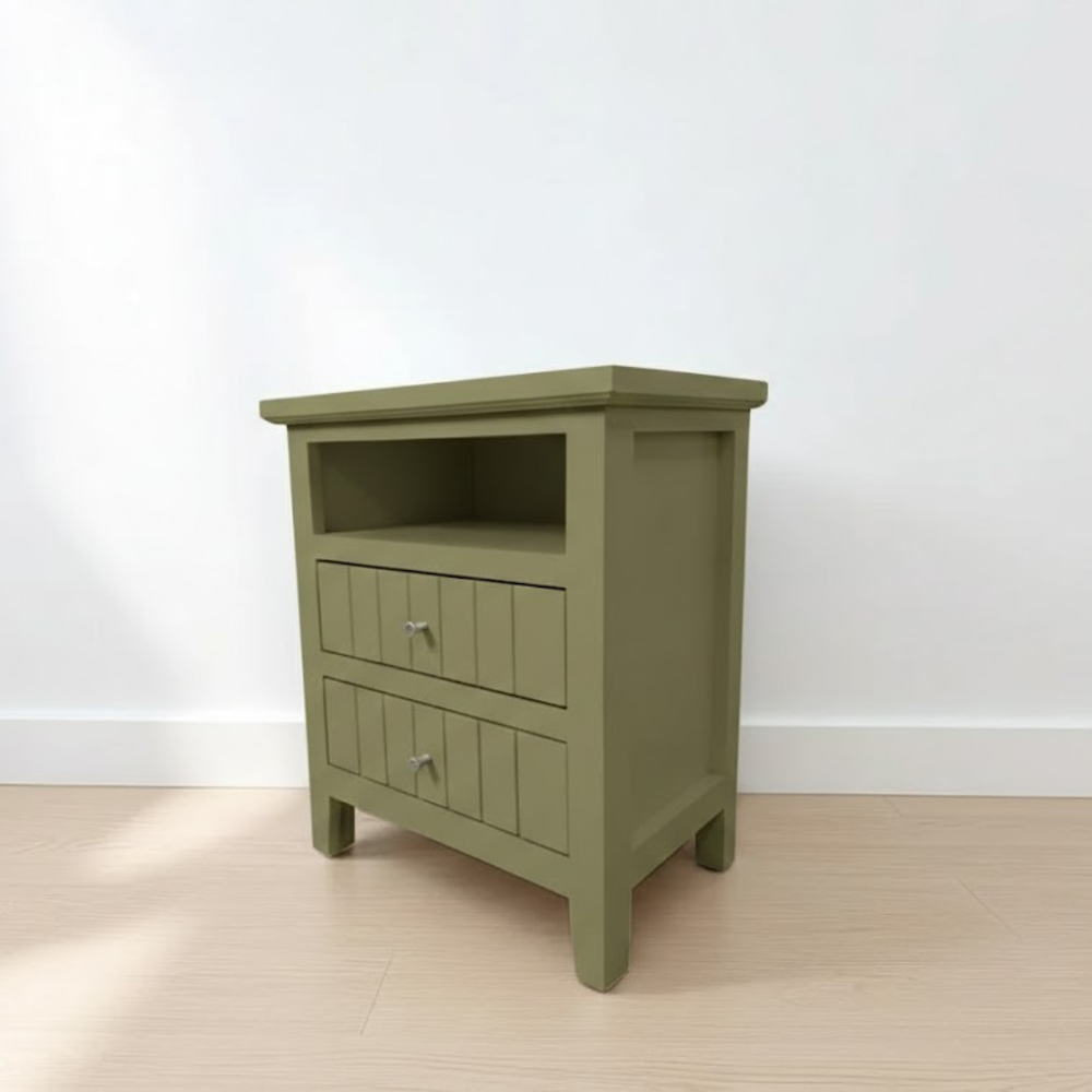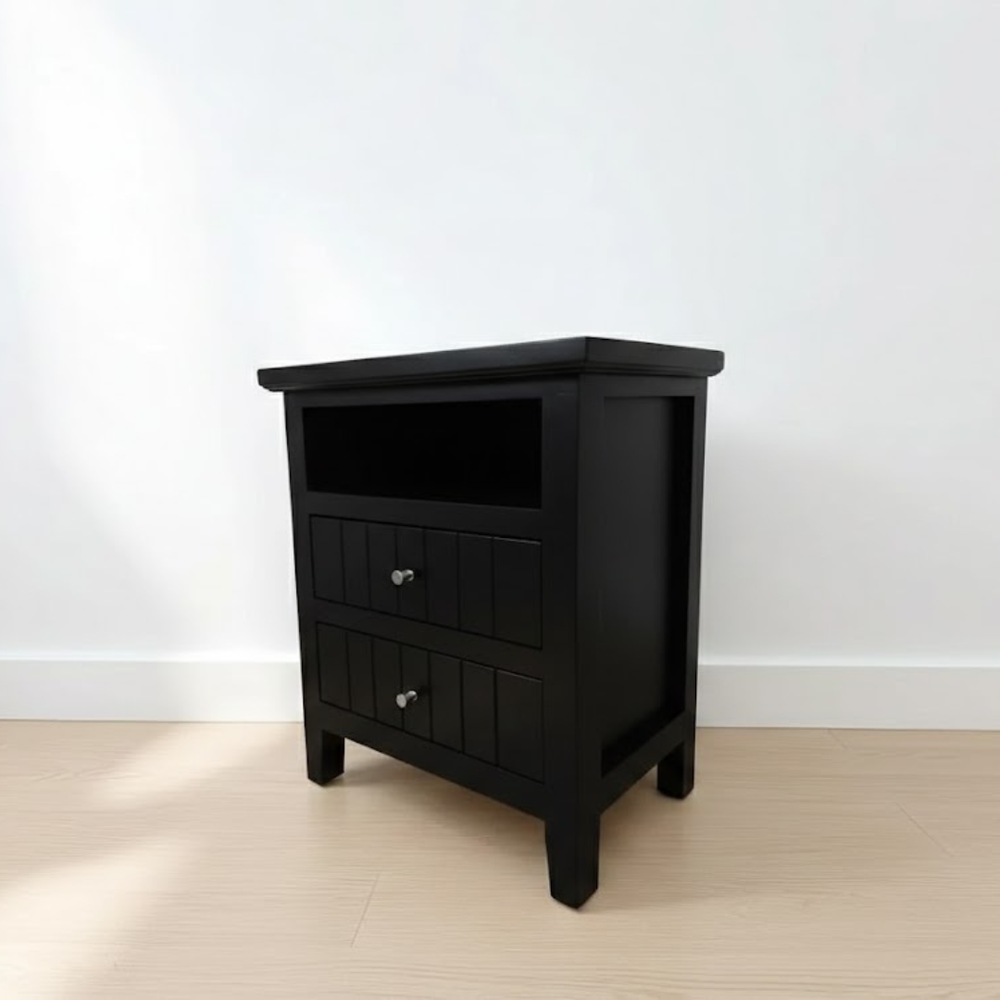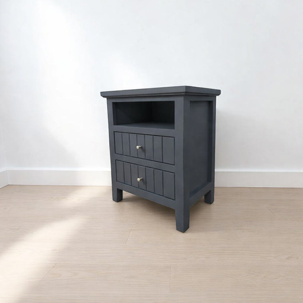 Fabricado artesanalmente en Chile, este velador de madera de pino destaca por su robustez y terminaciones de alta calidad. Siguiendo nuestro compromiso con la excelencia, la estructura recibe un acabado de pintura al agua con sellador (ecológica y sedosa), mientras que la superficie superior y frentes son protegidos con sellador y laca de alta resistencia, garantizando durabilidad ante el uso diario.