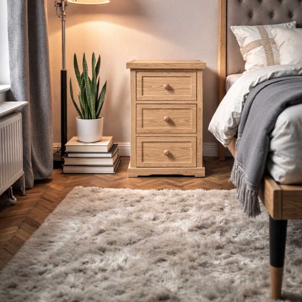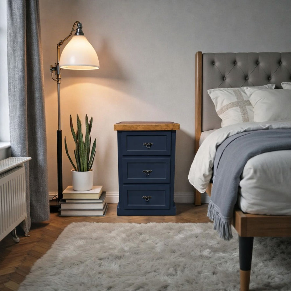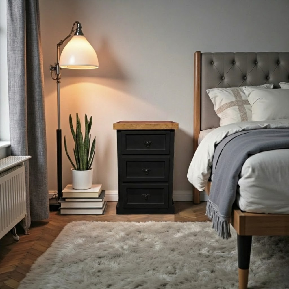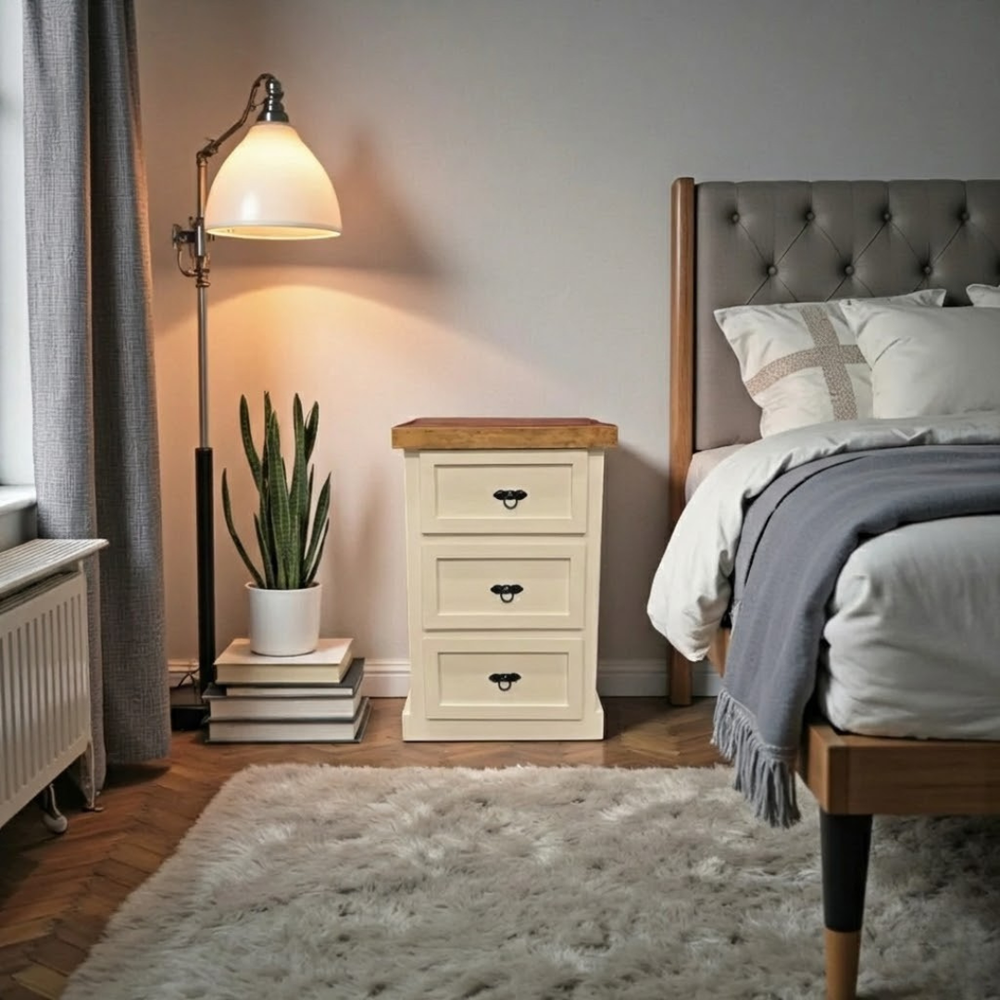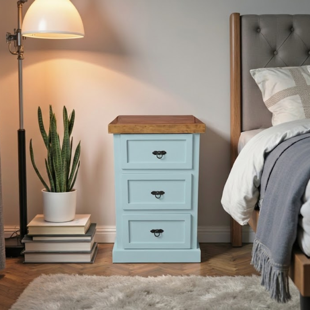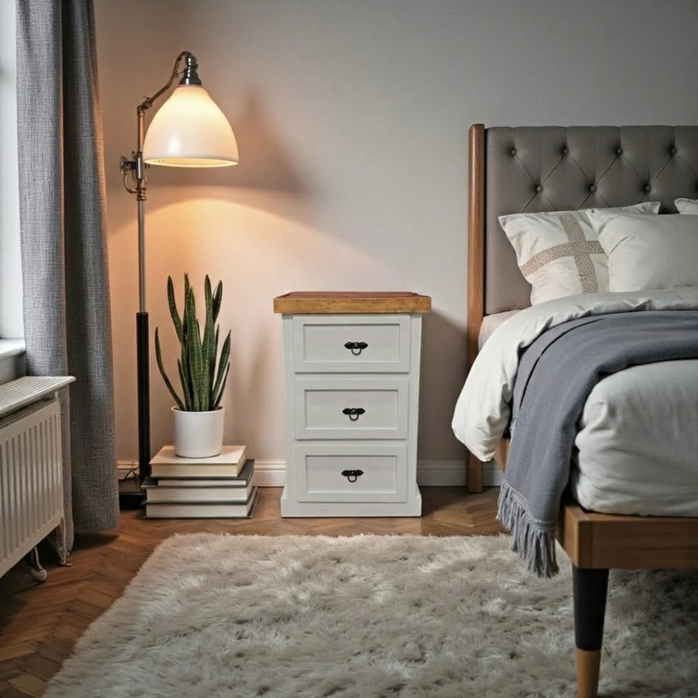 Fabricado artesanalmente en Chile, este velador de madera de pino destaca por su generosa altura de 70 cm. Para asegurar un acabado de alta gama, aplicamos pintura al agua con sellador en la estructura (ecológica y sedosa), mientras que la superficie superior y frentes son protegidos con sellador y laca de alta resistencia, garantizando durabilidad frente al roce diario de lámparas, libros y dispositivos.