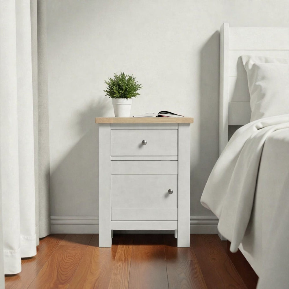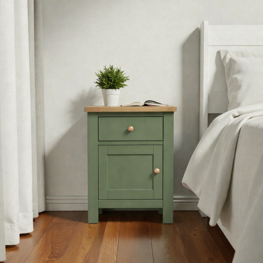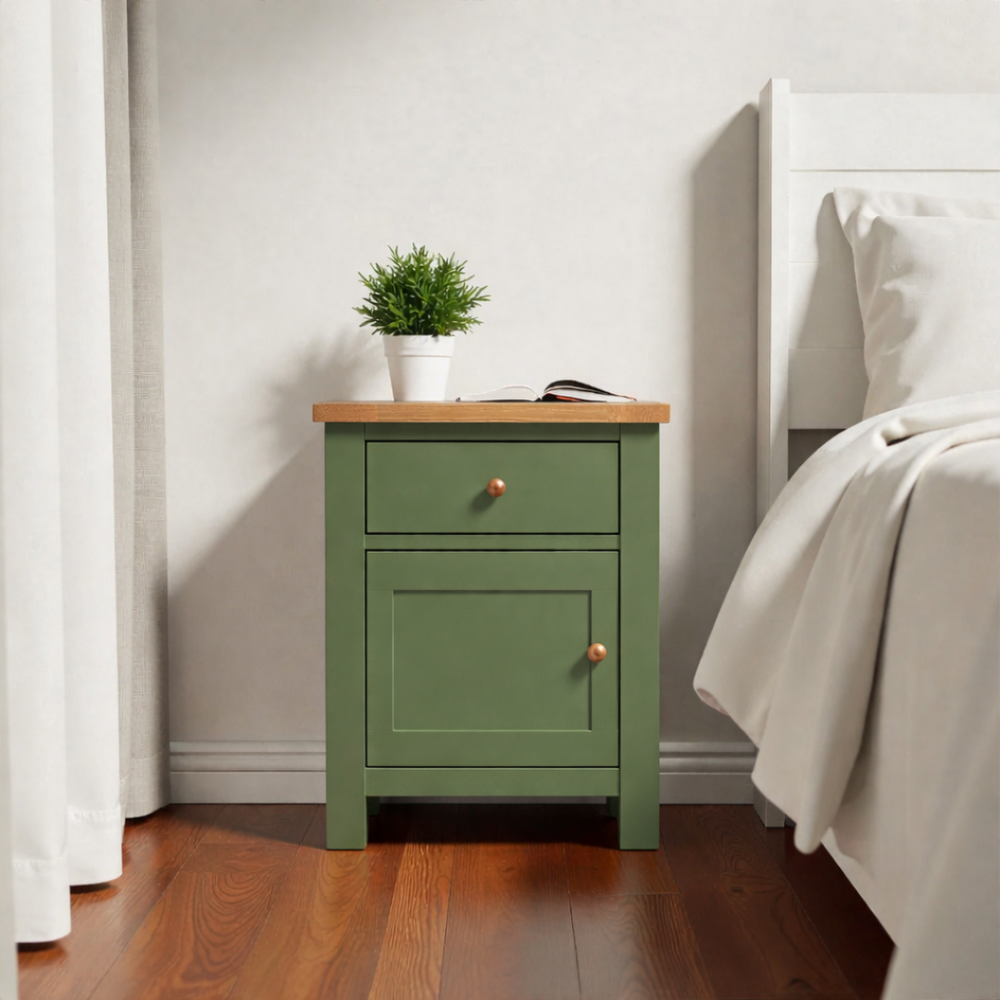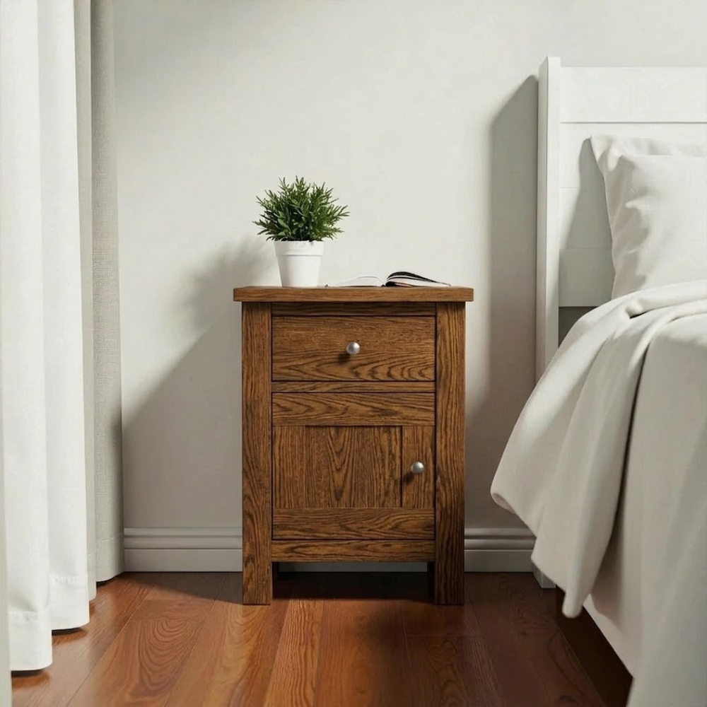 Fabricado artesanalmente en Chile, este velador de madera de pino destaca por su construcción sólida y terminaciones de alta gama. Para garantizar un mueble de estándar superior, aplicamos pintura al agua con sellador en la estructura (ecológica y sedosa al tacto), mientras que la superficie superior es protegida con sellador y laca de alta resistencia, asegurando que el acabado estilo roble (o el de tu elección) luzca impecable por años.