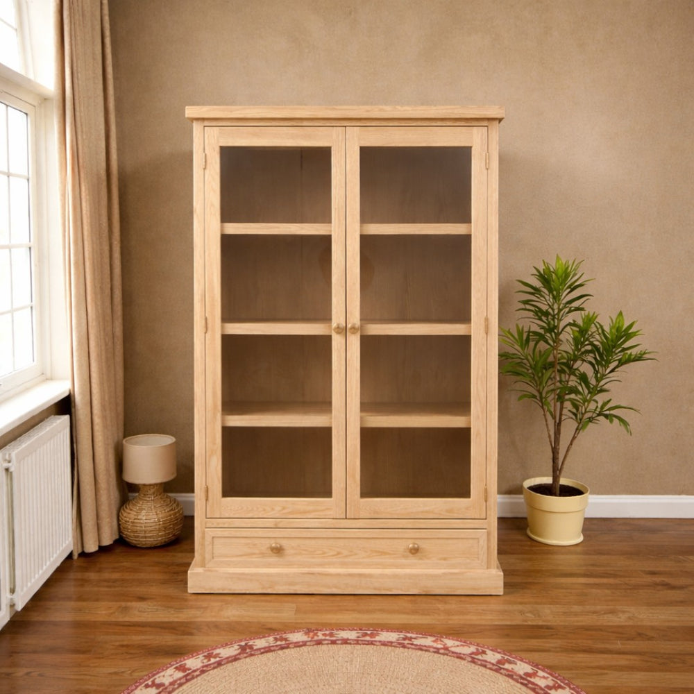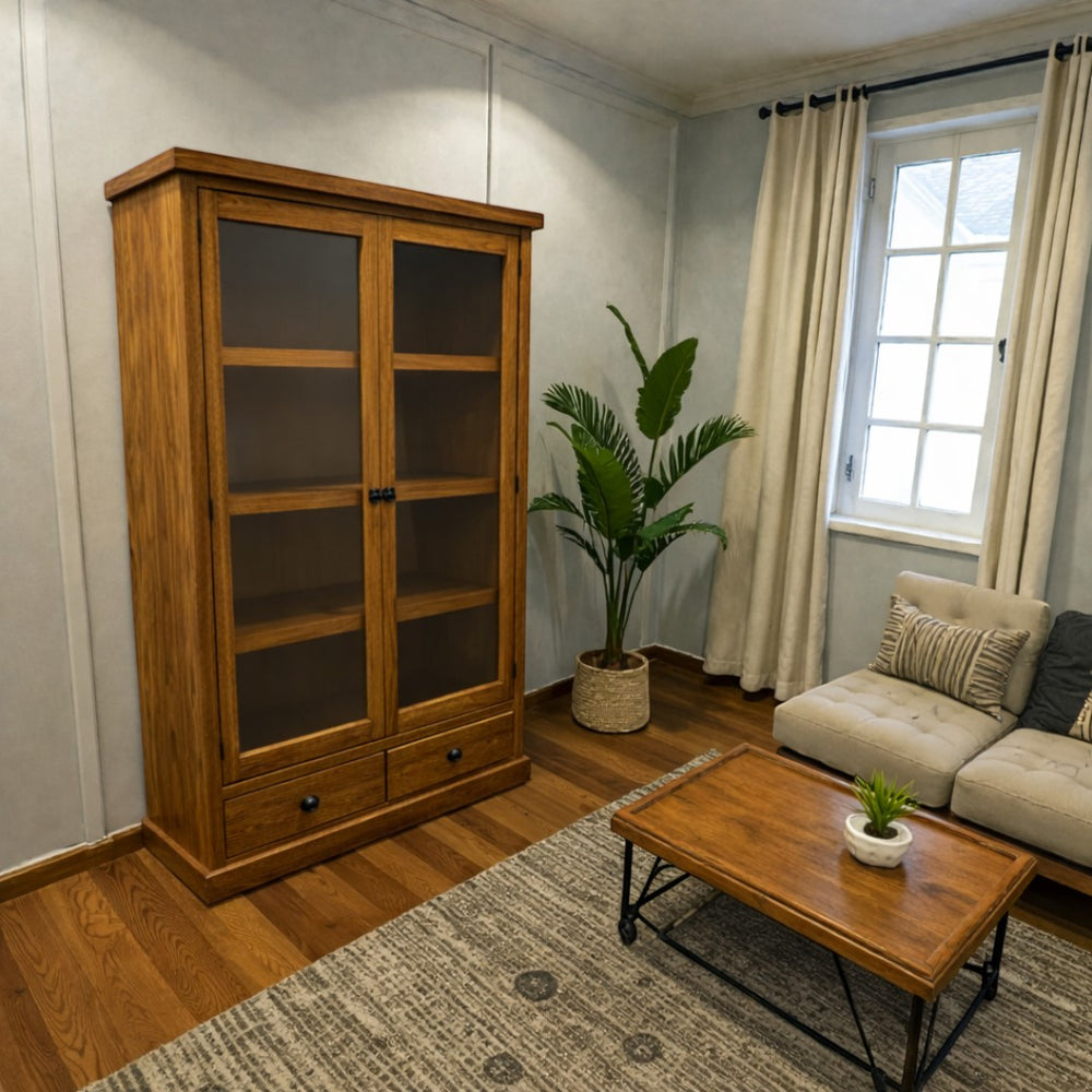 Fabricada artesanalmente en Chile, esta vitrina de gran formato destaca por su robusta estructura en madera maciza y acabados orgánicos. Aplicamos un tratamiento premium que resalta la veta natural, logrando una textura táctil única que invita a la calma y aporta una sofisticación rústica inigualable a tu hogar.